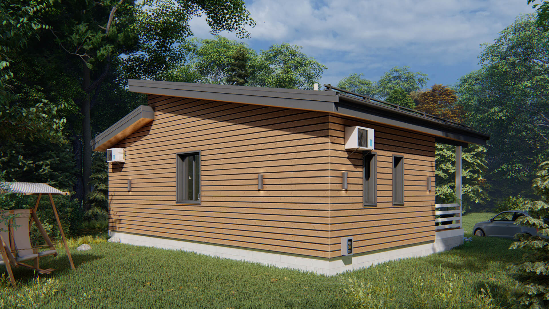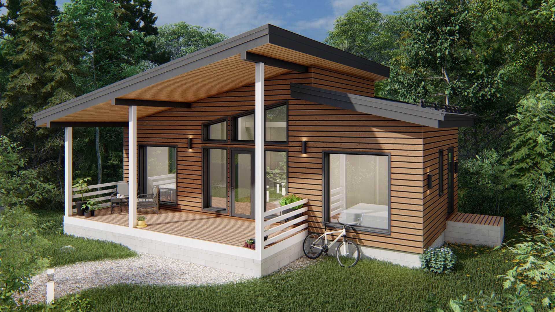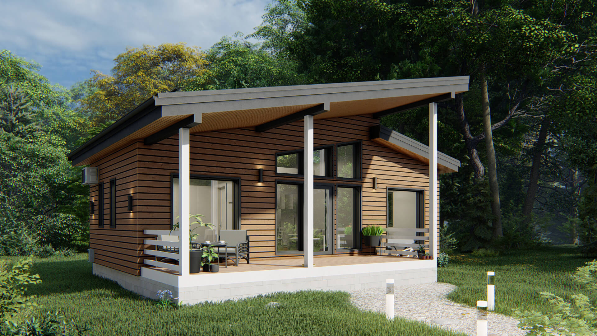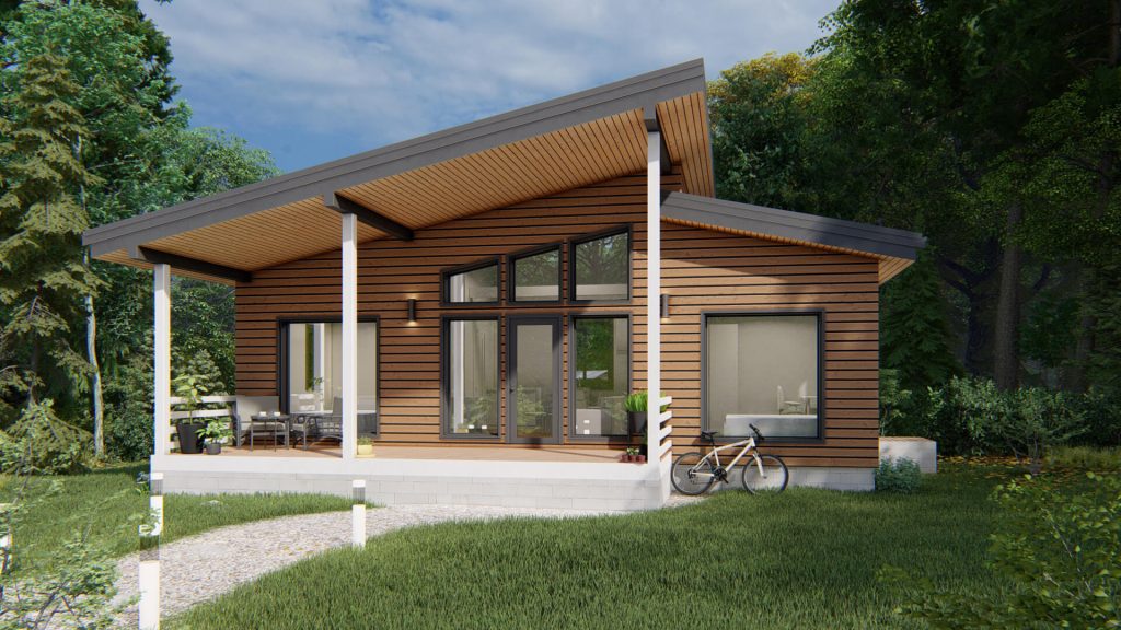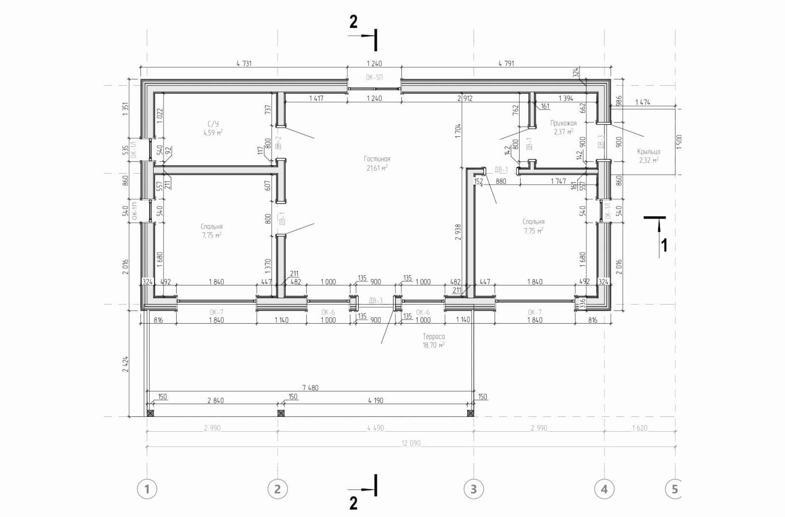 - Дом на 2 спальни, просторную кухню-гостиную, санузел, прихожую, террасу и крыльцо