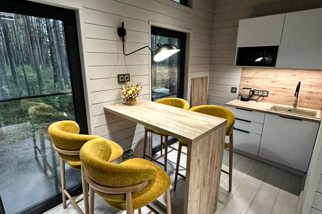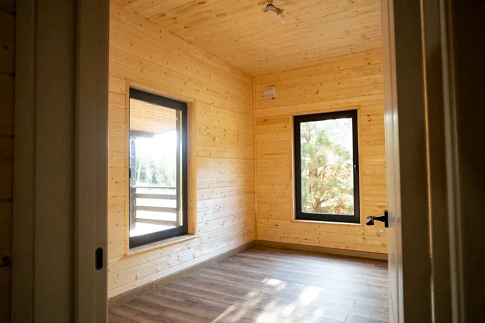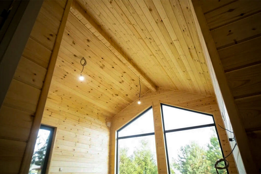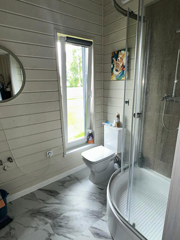 Внутренняя отделка стен каркасного дома выполняется деревянной вагонкой – имитацией бруса сорта AB без окрашивания (при желании возможна покраска в любой цвет). Потолок также зашивается имитацией бруса, создавая единый стиль отделки. В санузле предусмотрена специальная отделка: стены обшиваются влагостойкой вагонкой с имитацией бруса, а на пол укладывается износостойкий кварц-винил, устойчивый к влаге. Такой вариант отделки изнутри придает дому уютный, экологичный интерьер.